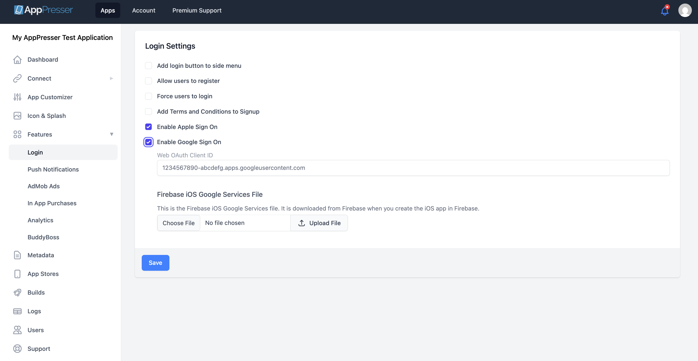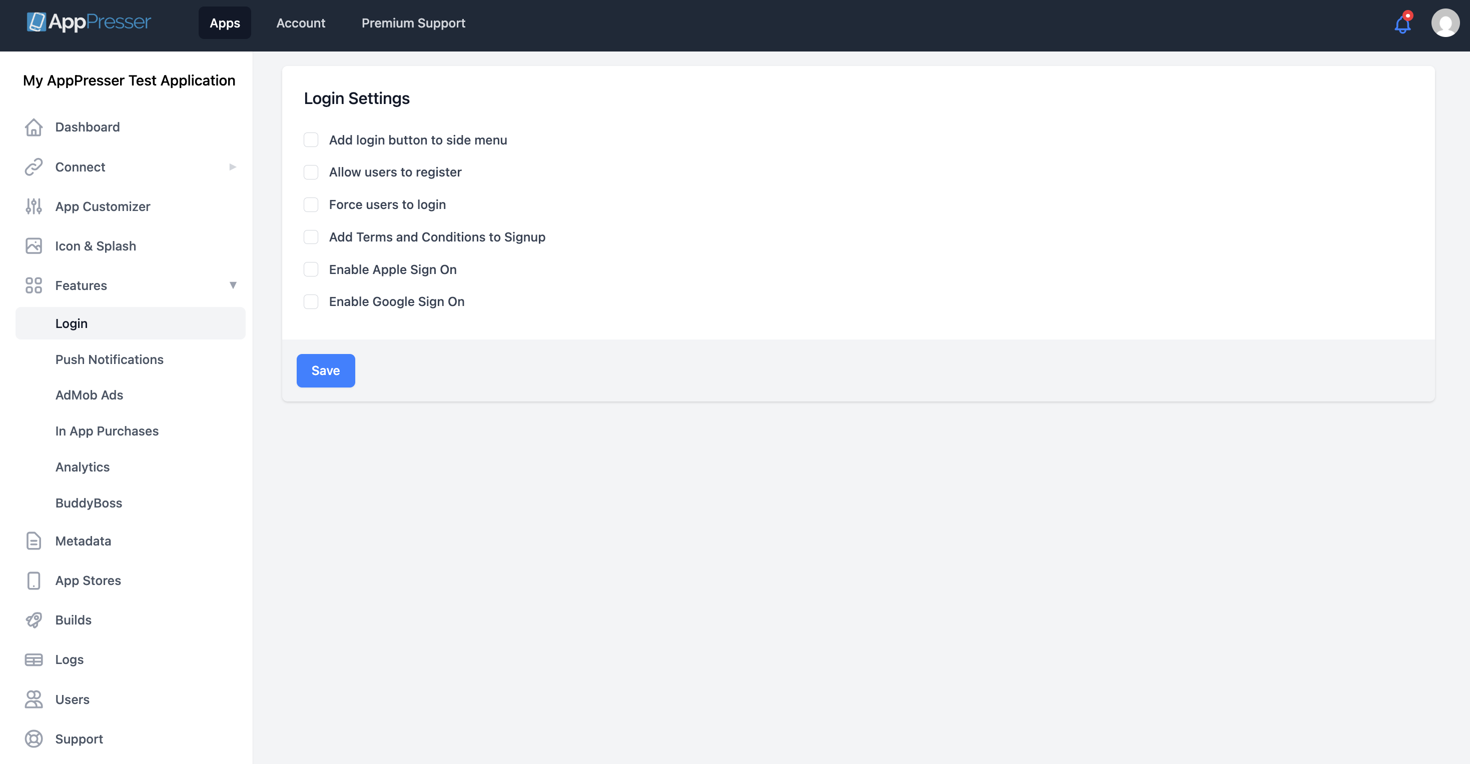 There are six main features you can choose to enable inside of your application. Each feature has it's own sub-menu page item where you can review all of the options. The six main features are Login, Push Notifications, AdMob Ads, In App Purchases, Analytics and BuddyBoss.